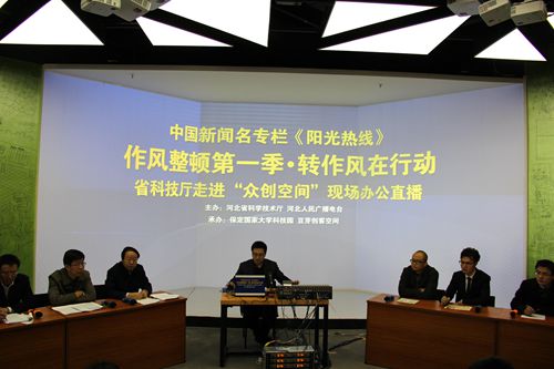 2016年2月29日,省科技廳黨組副書記、副廳長郭玉明帶領(lǐng)高新技術(shù)發(fā)展及產(chǎn)業(yè)化處、中小企業(yè)創(chuàng)新資金管理中心有關(guān)負(fù)責(zé)同志走進(jìn)保定國家大學(xué)科技園“豆芽創(chuàng)客空間”,舉辦“轉(zhuǎn)作風(fēng)·新春走進(jìn)眾創(chuàng)空間”活動,并依托河北電臺“陽光熱線”欄目,以“轉(zhuǎn)作風(fēng),積極引導(dǎo)、扶持‘眾創(chuàng)空間’發(fā)展”為主題與創(chuàng)業(yè)導(dǎo)師、創(chuàng)業(yè)者代表近距離、零障礙、無縫隙的交流對接,傾聽意見,解決難題,現(xiàn)場辦公。